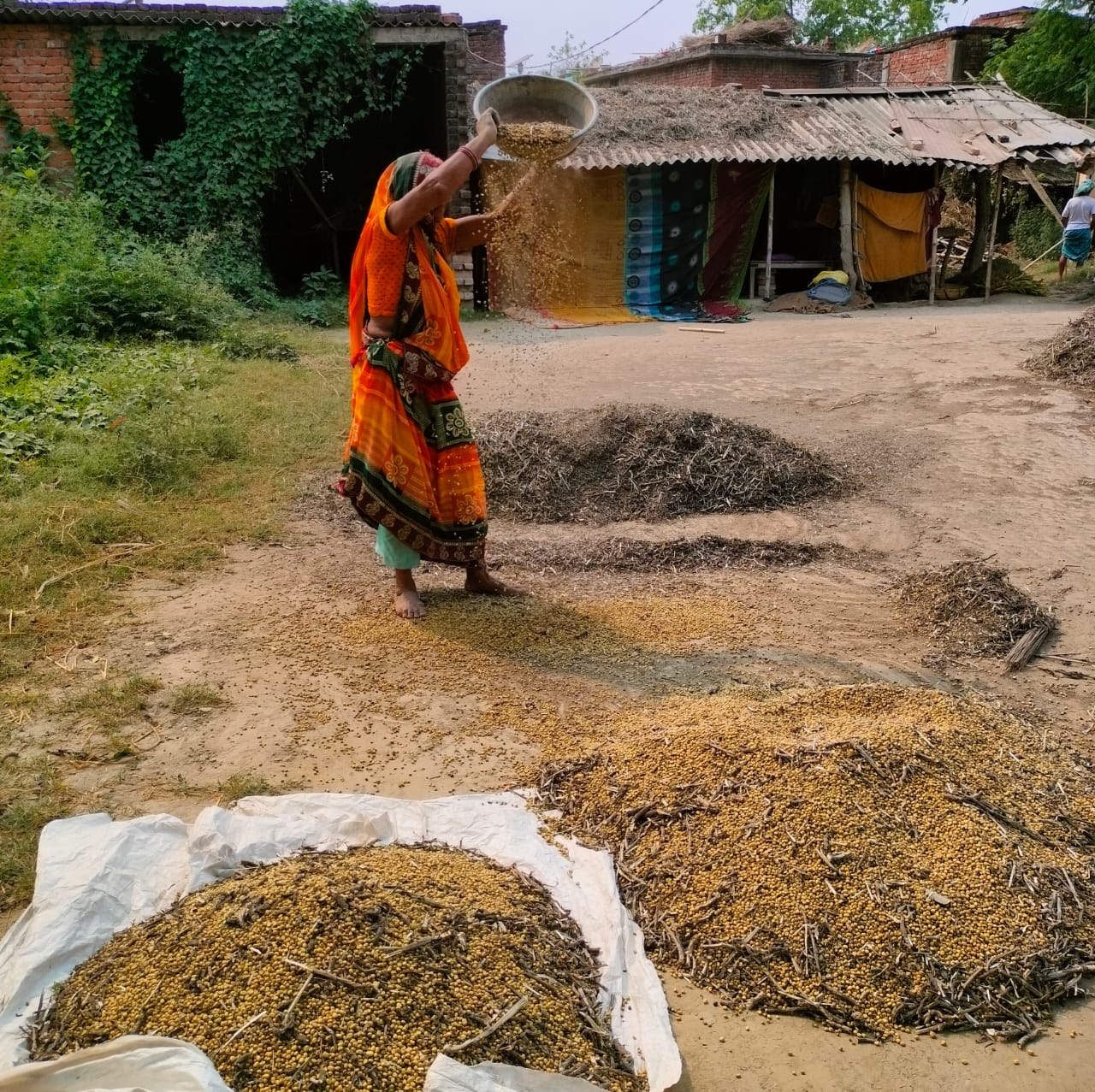 Experience the age-old tradition of winnowing, where farmers skillfully separate the golden grains from husk and chaff using the gentle power of the wind. This simple yet fascinating process showcases the wisdom of rural life, turning harvested crops into clean, ready-to-use grains. Visitors can witness and even try this timeless practice, connecting closely with the rhythm of village farming. Winnowing the Grains means the traditional process of separating grains (like wheat, rice, millet, etc.) from husk, chaff, or unwanted lighter particles after threshing.The mixture of grain and chaff is collected after threshing.Farmers toss the mixture into the air using a winnowing basket, tray, or shovel.The wind blows away the lighter husk and chaff, while the heavier grains fall straight down.To get clean grains ready for storage, cooking, or selling.