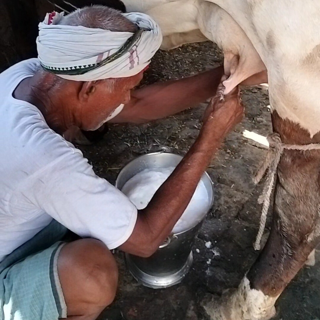 Step into the authentic charm of rural life as you learn the age-old practice of hand-milking a cow. Guided by local villagers, guests experience how fresh milk is collected every morning in a traditional way. This activity not only connects you with nature and the animals but also lets you understand the bond between farmers and their cattle. The fresh aroma of cow’s milk and the peaceful surroundings make this an unforgettable village experience. An elderly farmer, wearing a white turban and simple traditional attire, is seen milking a cow inside a rustic cowshed. The cow, with a striking mix of black, white, and brown patches, stands calmly as the farmer skillfully fills a metal bucket with fresh milk. Sunlight filters gently through the bamboo walls of the shed, highlighting the natural and rural charm of the scene. The rope tied around the cow’s legs ensures safety during the milking process. This authentic moment beautifully captures the essence of traditional village life, where dairy farming remains a vital part of daily livelihood and culture.
